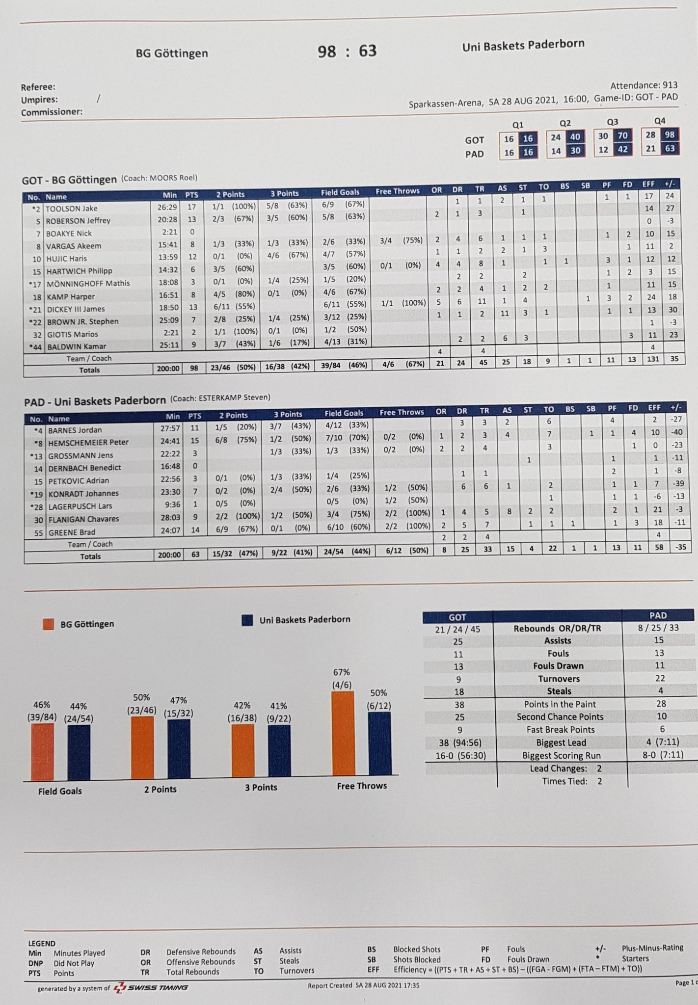BG Göttingen![]() | 9.8.2021 22.8.2021 27.8.2021 28.8.2021 4.9.2021 7.9.2021 11.9.2021 17.9.2021 | Trainingsauftakt 100:73 gegen Medipolis SC Jena 76:86 gegen Eisbären Bremerhaven 98:63 gegen Paderborn Baskets 104:72 gegen Kangoeroes Melchelen 85:52 gegen Okapi Aalst 95:77 bei Telenet Giants Antwerpen 88:78 bei Hamburg Towers | – Stats | Recap Stats | Recap Stats | Recap Stats | Recap Stats | Recap Stats | Recap Stats | Recap |